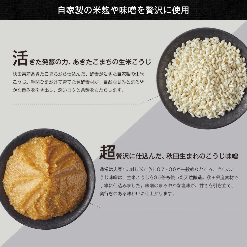 あきたこまちの米こうじを贅沢に使用した天然醸造・無添加の味噌、あきたこまちの米こうじを使用した甘酒など、発酵素材とスイーツを組み合わせた商品開発に取り組み、構想から3年。