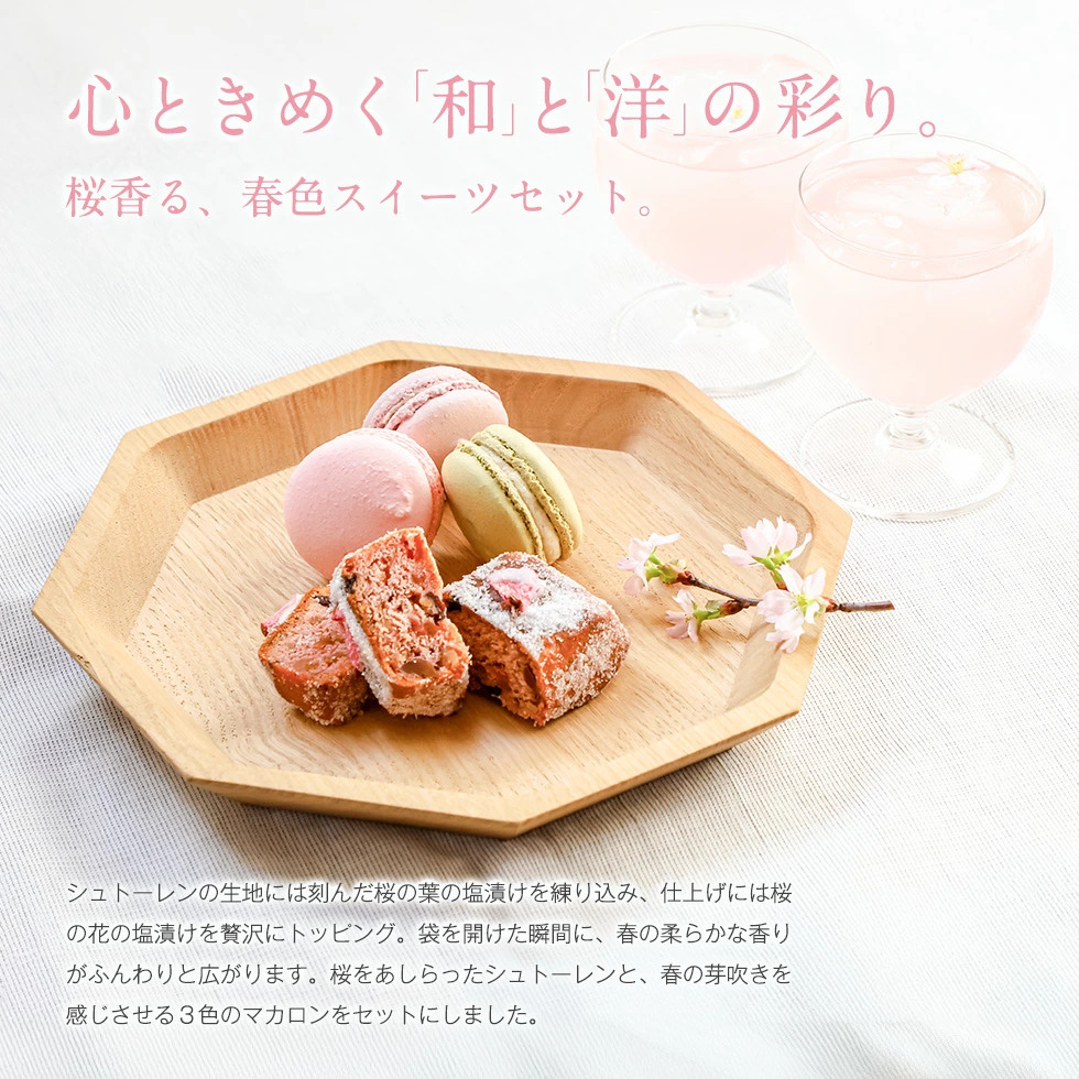 シュトーレンの生地には刻んだ桜の葉の塩漬けを練り込み、仕上げには桜の花の塩漬けを贅沢にトッピング。袋を開けた瞬間に、春の柔らかな香りがふんわりと広がります。桜をあしらったシュトーレンと、春の芽吹きを感じさせる3色のマカロンをセットにしました。